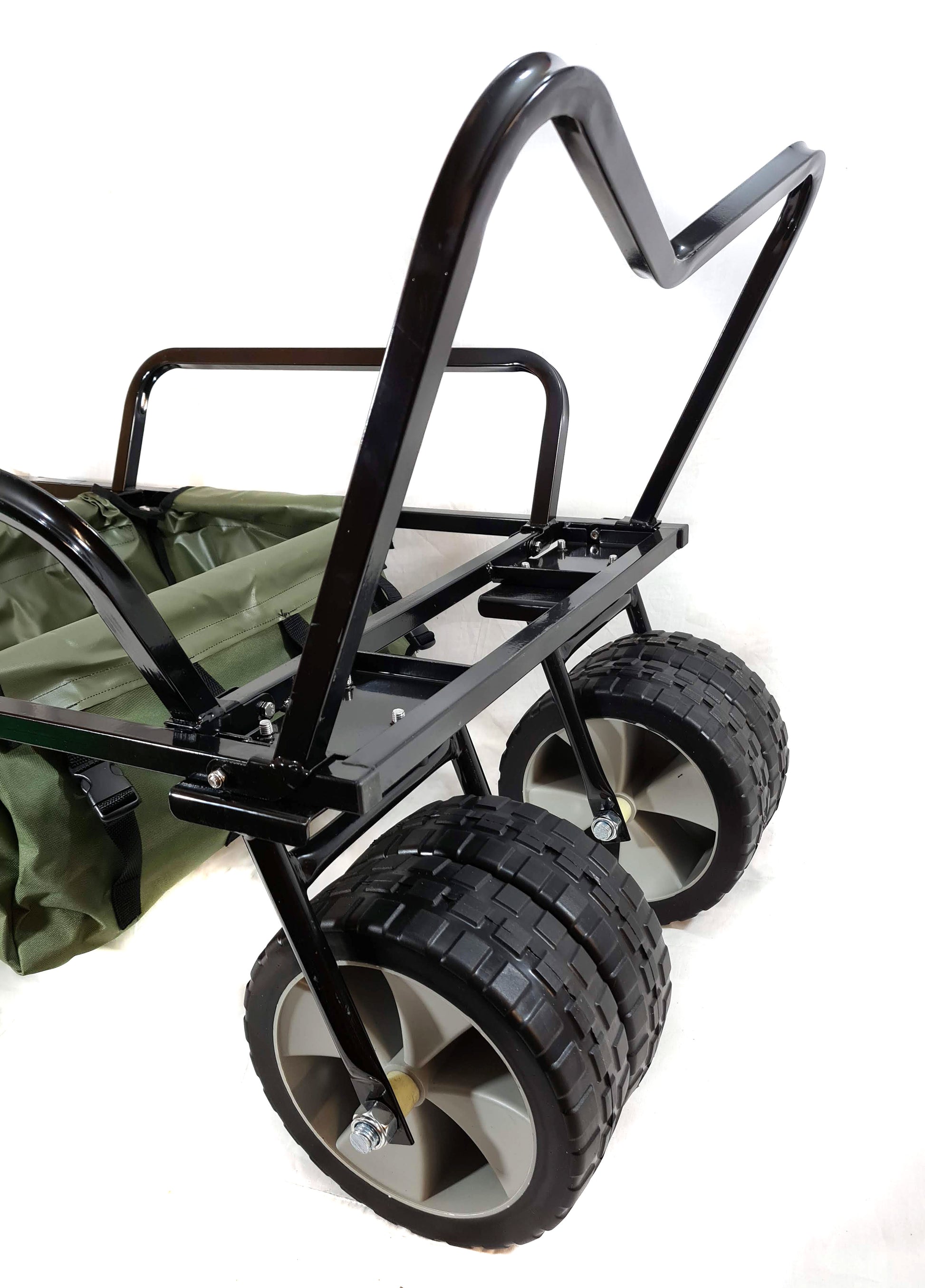 Brand New heavy duty four wheel wheelbarrow trolley which makes carrying heavy loads simple and easy. This barrow has a huge carrying capacity and with four 10" puncture poof tyres, it is good on any terrain and will handle far heavier loads than a standard fishing trolley. Puncture proof pneumatic wheels.