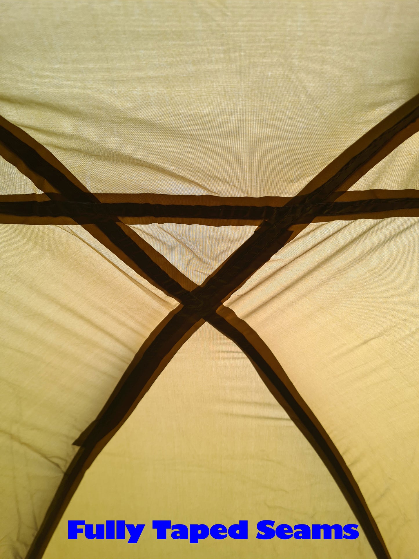 Bison had this popular day shelter made with fully taped and waterproof seams to suit British weather, This bivvy is for sale all over the world and is a great piece of kit but without taped seams it is pretty useless on a rainy day, so please ask the supplier if you are tempted to buy a slightly cheaper version if the seams are taped.