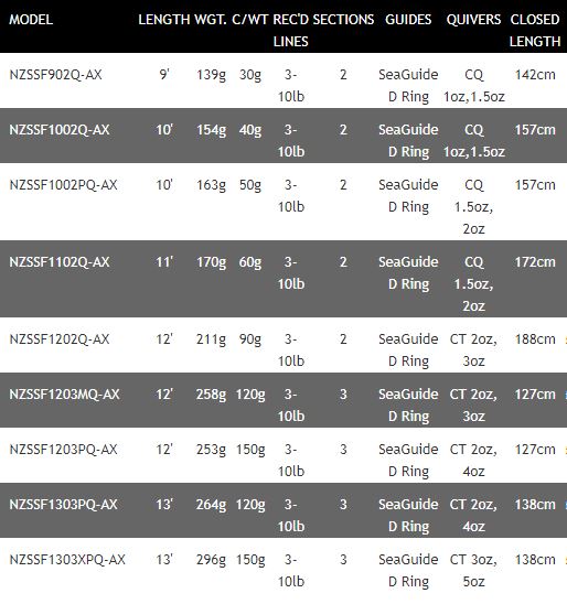 Their balanced performance of power and lightness is enhanced by the use of weight saving SeaGuide D Ring guides and carbon quiver tips.