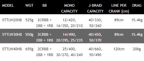 Each model features 5 ball bearings (2CRBB+2BB+1RB) for a smooth performance and a 6.1:1 on the 20 and 30 but swifter ratio of 6.4:1 on the bigger 40 model. Line per handle turn is 89cm on the 20 and 30 with the 40 cranking back an impressive 120cm per rotation. The series also accommodates impressive line capacities ranging from 420m of 12lb mono on the 20 up to 660m of 40lb J-Braid on the 40. Max drag runs from 15.4 pounds for size 20 and 30 reels to 20-pounds for size 40 models