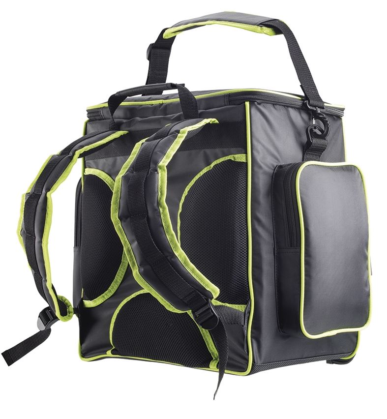 High capacity, durable rucksack with four big tackle boxes in the main compartment and two small tackle boxes at the side.