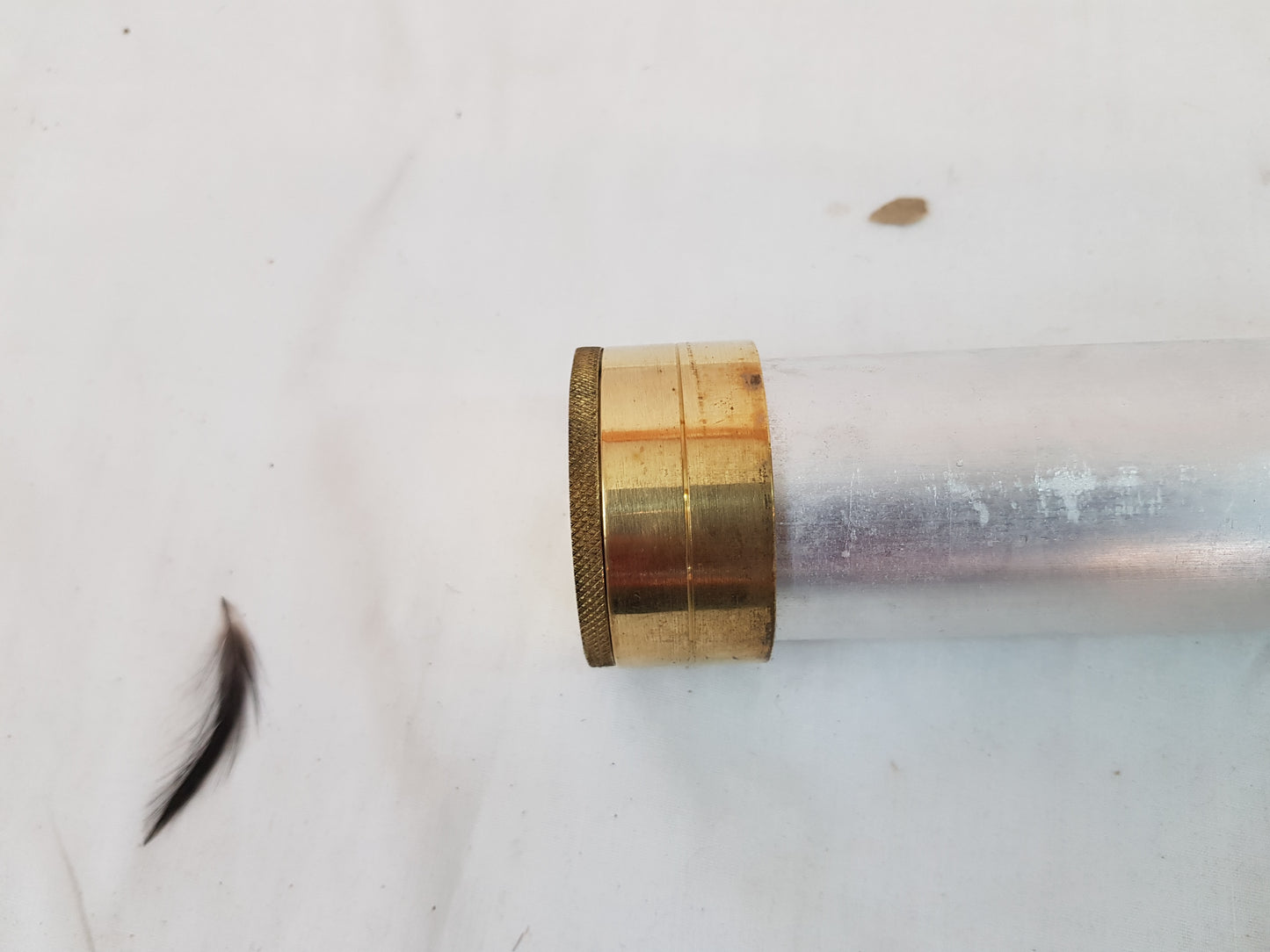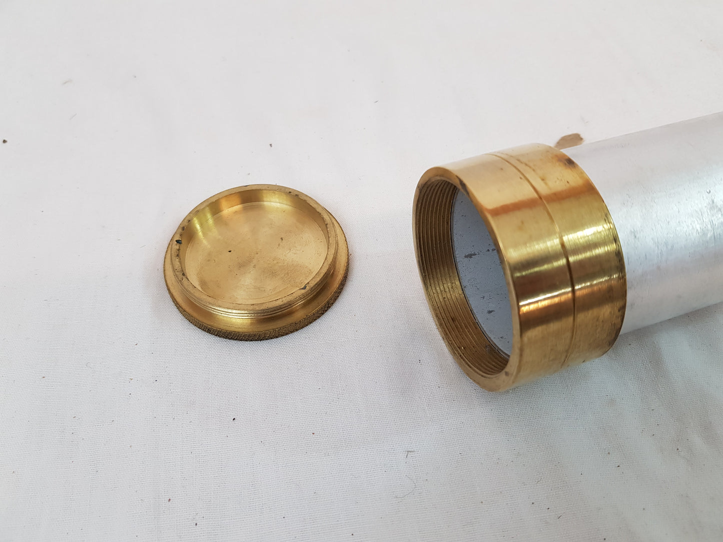 This is a very heavy bomb proof rod tube made from aluminium tube id 47mm od 50mm with brass end fitting , it is a bit dirty and oxidized becuase they have been lying in our store for years ,We used them for sending very expensive fly rods worldwide . but they are no longer required ,